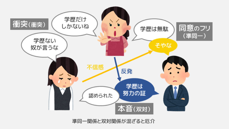 このときはひどいマザコン野郎めと思いましたし、結婚したら嫁姑問題が起こることは間違いないと思いました。ただ、お母さんと彼が準同一関係であることを考慮すれば、彼の態度も理解できます。準同一関係は、「意見が合っているフリ」をすることで保たれるという難しい関係なのです。つまり、ここでお母さんに反論したところで親子関係かつ上司部下の関係が悪化してしまうことになる。彼にとってもどうしようもない状況ではあったのでしょう。そして彼は「2人が仲良くすればいいだけだろ」と言うのですが、それも困難な状況でした。なぜなら私とお母さんは「衝突関係」で、既に衝突が始まっていたからです。